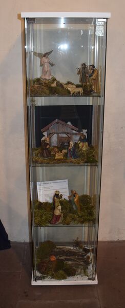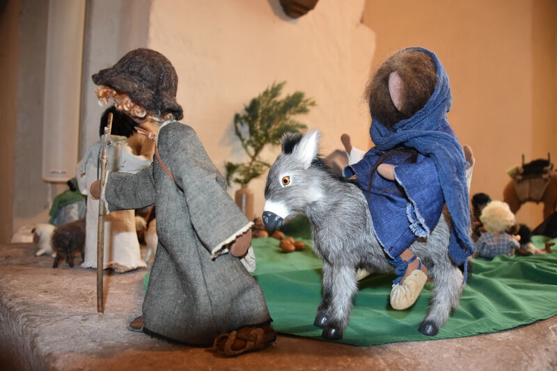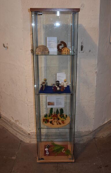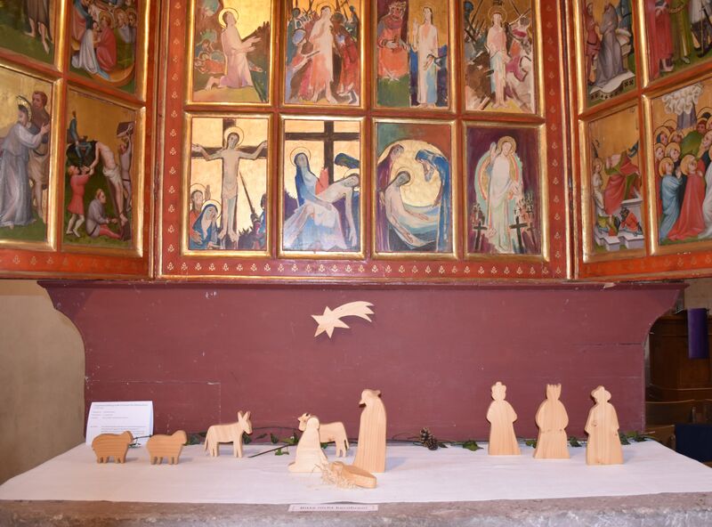 Auch sie selbst habe eine Krippe beigesteuert. Das besondere an den von ihr selbst nach einem Konzept von Doris und Primo Egli hergestellten Figuren ist, dass sie ein Drahtgestell und Füße aus Blei haben. So können sie in jede natürliche Körperhaltung geformt werden. „Bei vielen traditionellen Krippen liegt das Jesuskind in einer Krippe. Dies übrigens erst seit Martin Luther. Bei meiner Krippe kann Maria ihr Kind auf den Arm oder auf den Schoss nehmen. Dadurch wird eine Mutter-Kind-Beziehung dargestellt, wie auch bei der gotischen Madonna mit Kind aus dem 15. Jahrhundert über dem Altar mit den Erzählfiguren“, erläutert Hecke-Behrends. Eine weitere Besonderheit ist, dass sie die Szene mit den Figuren an jedem Advent verändert. Sind Maria und Josef zu Beginn noch auf der Suche nach einer Herberge, kommen sie am vierten Advent in Bethlehem an und Jesus kommt auf die Welt.