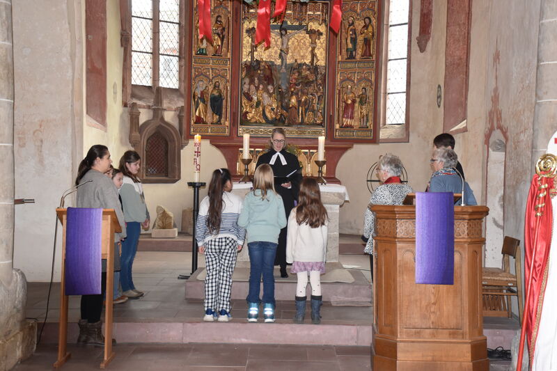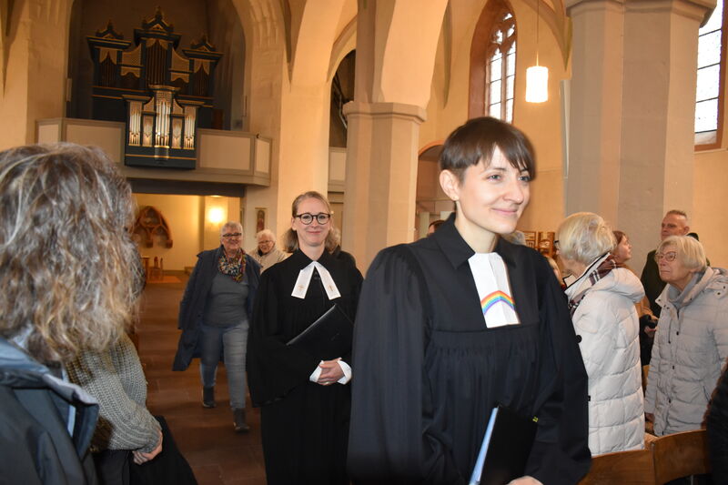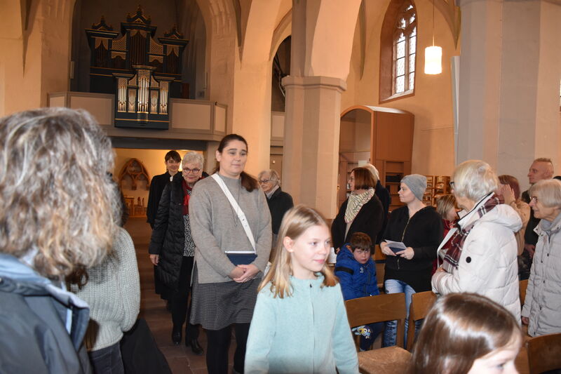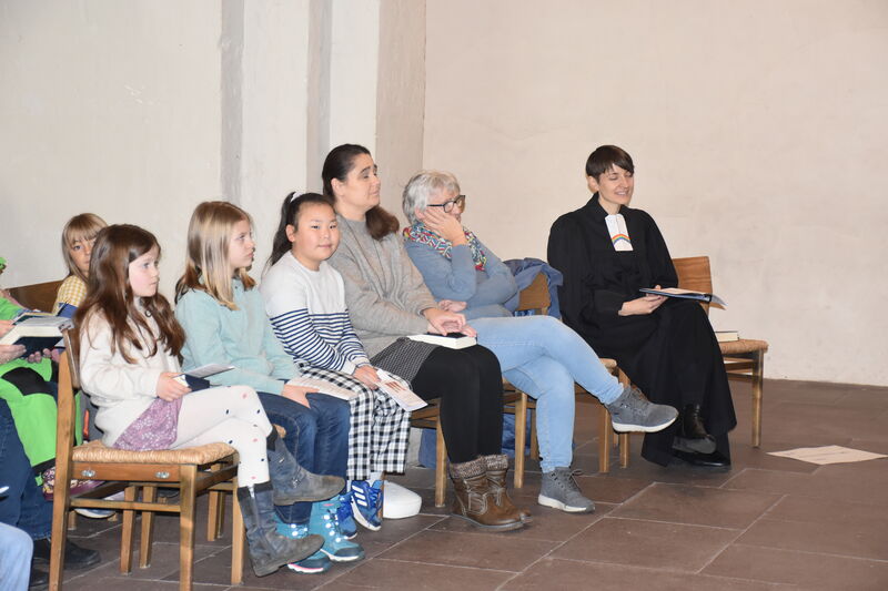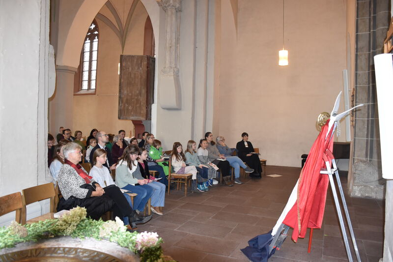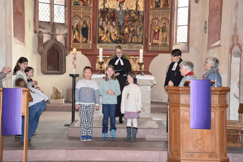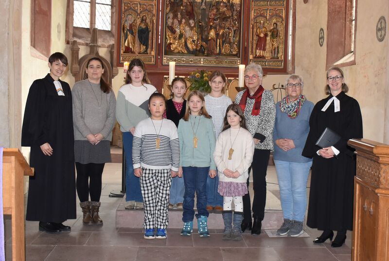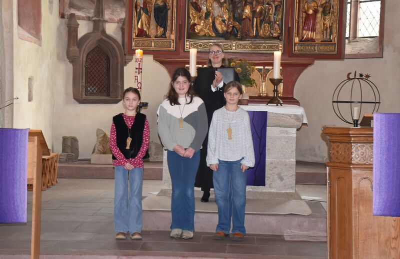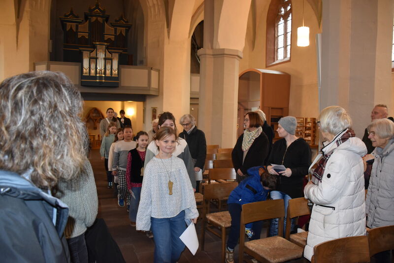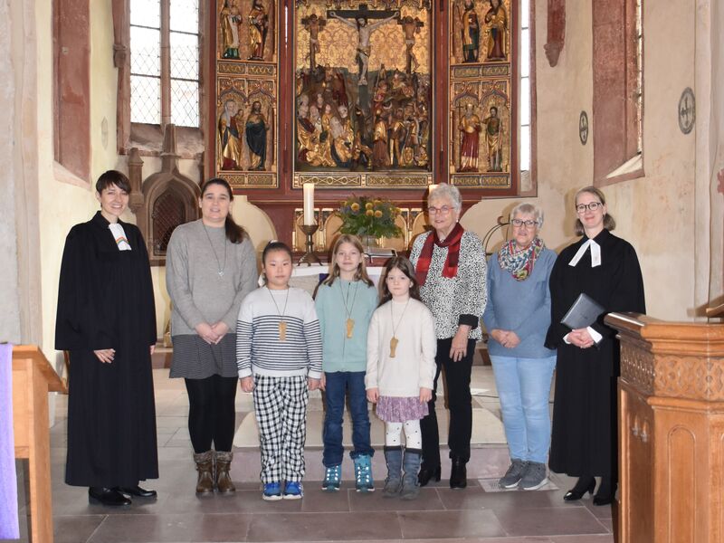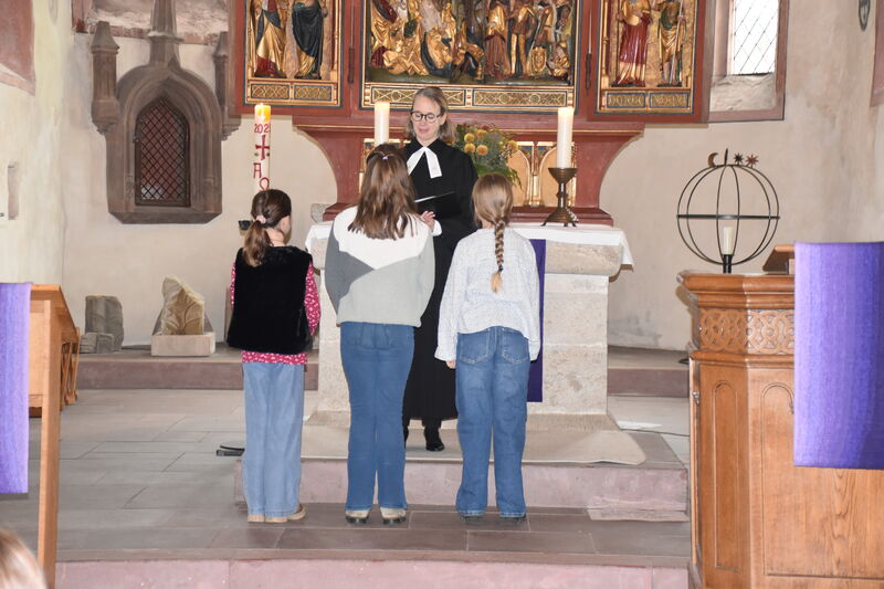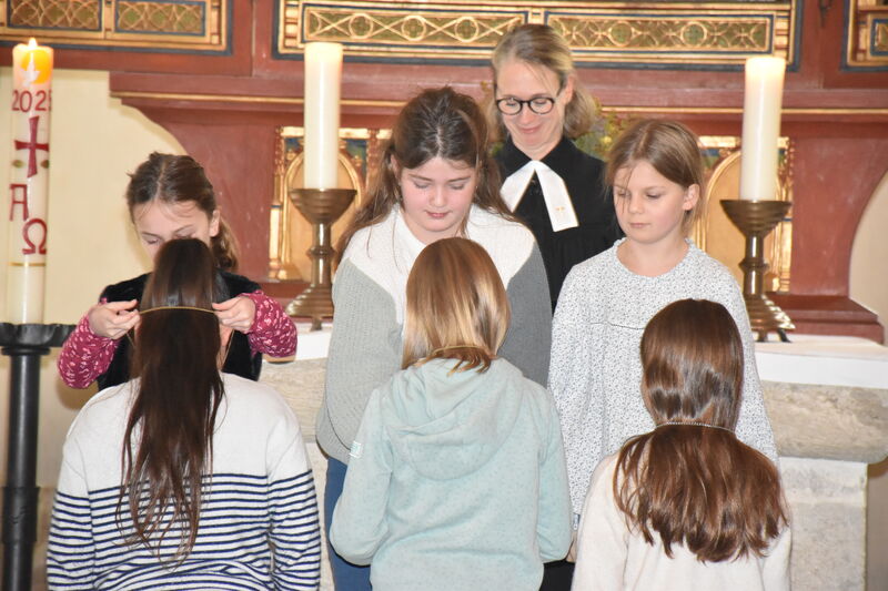 Nach der Verabschiedung führte Superintendentin Günther-Menzel die neuen Kinderbischöfinnen in ihr Amt ein. Von ihren Vorgängerinnen bekamen sie die Bischofsketten umgehängt, die sie bei allen Aktionen ihrer Amtszeit als Zeichen ihrer Kinderbischofswürde tragen.