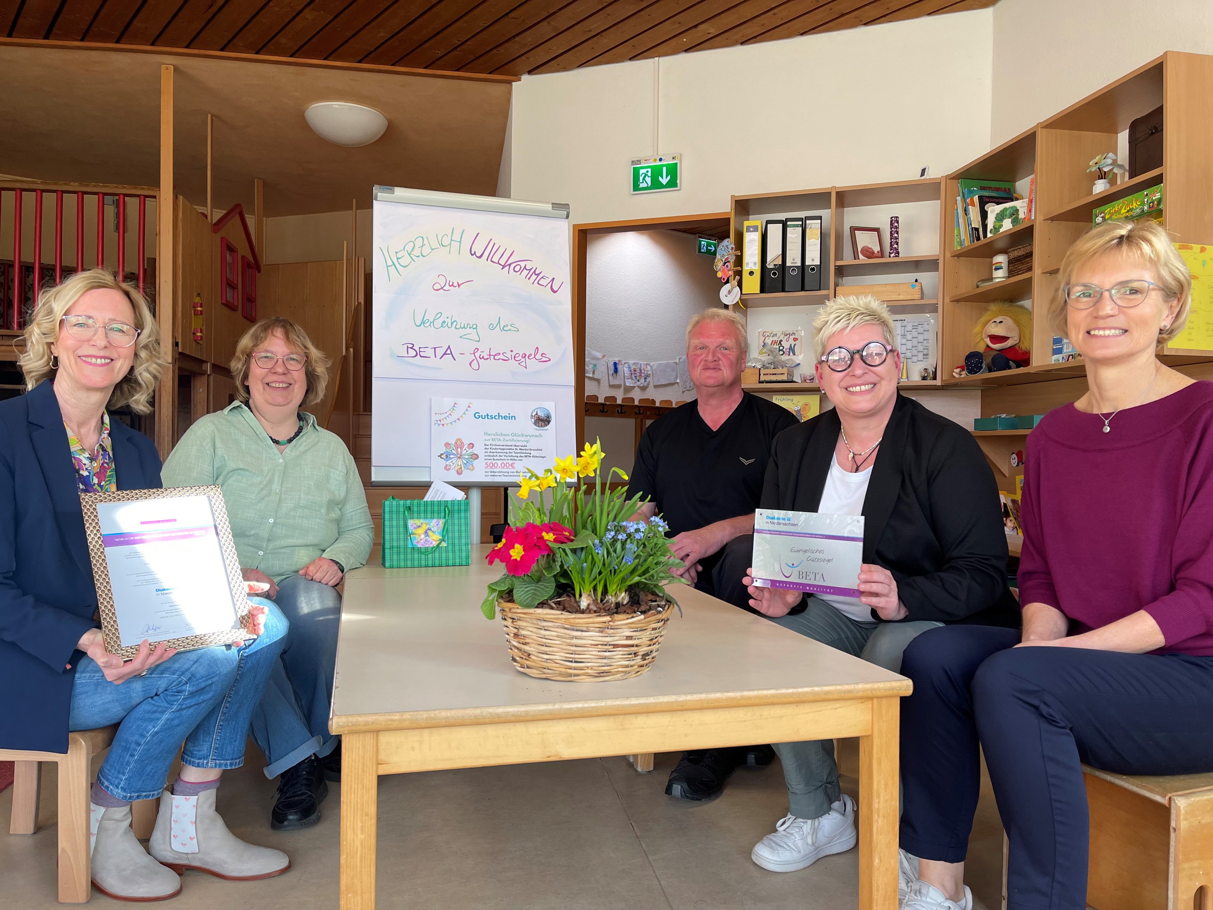 Ein multiprofessionelles Team für Kita und Krippe arbeitet in der evangelischen Kindertagesstätte St. Martini zusammen und stellt durch ein strukturiertes Qualitätsmanagement sicher, dass die pädagogische Arbeit sich ständig weiterentwickelt: Das wurde der Kita jetzt mit der Verleihung des BETA-Gütesiegels ganz offiziell bestätigt. Kita-Leiterin Ina Kellner erhielt die Urkunde aus den Händen von Fachberaterin Martina Zunke-Scharf, die namens Dr. Eva Berns, Bereichsleiterin der Fachberatung evangelischer Kindertagesstätten im Diakonischen Werk Niedersachsen, nach Dransfeld gekommen war, und Isabel Göring, pädagogische Leiterin des Kindertagesstättenverbandes Göttingen-Münden.